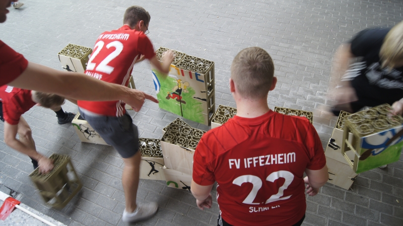 Beim anschließenden Tic Tac Toe balgten sich die Teams darum, als erstes ihre Säckchen in eine gerade oder diagonale Linie zu bringen. Fummeln und Merken will gelernt sein: In einem Sack 15 Gegenstände zu ertasten, sich diese zu merken und dann zu Papier zu bringen hört sich leichter gesagt als getan an. Im Schnitt waren lediglich 6 – 7 Antworten richtig. Der Bobby Car – Parcour hatte es in sich: Der Fahrer trug eine blickdichte Brille und sein Vis-à-Vis  mußte ihn mit seinen Kommandos durch den Parcour führen. Im Vorteil war, wer sein Rechts und Links von dem des Gegenüber unterscheiden konnte. In die Knochen ging das „Sport – Bingo“, bei dem für jede unpassende Zahl Kniebeugen, Liegestützen, Gymnastikübungen und ähnlich schweißtreibende Dinge auszuführen waren. „Bier – Ping – Pong“ (ohne Bier), der Wassertransport per Schwamm, der Balltransport per Rinne und der Standweitsprung standen vor dem abschließenden Puzzeln des TVI – Games - Logo auf der Wettkampfliste.
