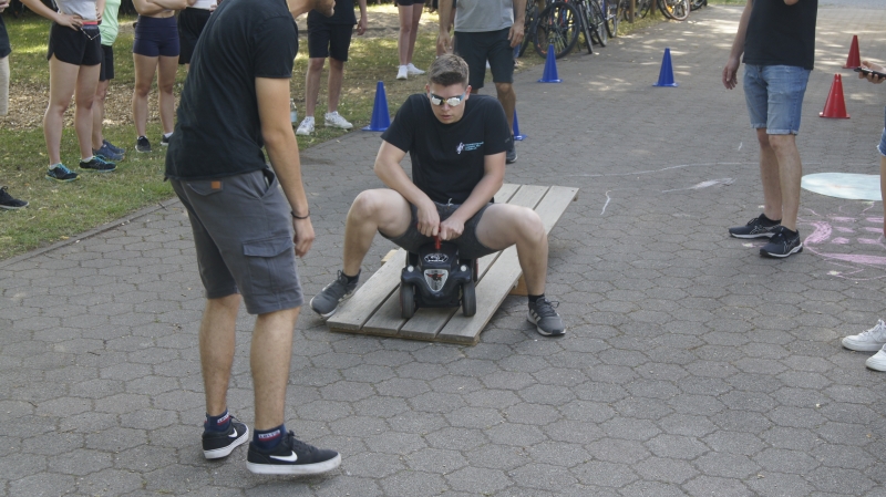 Beim anschließenden Tic Tac Toe balgten sich die Teams darum, als erstes ihre Säckchen in eine gerade oder diagonale Linie zu bringen. Fummeln und Merken will gelernt sein: In einem Sack 15 Gegenstände zu ertasten, sich diese zu merken und dann zu Papier zu bringen hört sich leichter gesagt als getan an. Im Schnitt waren lediglich 6 – 7 Antworten richtig. Der Bobby Car – Parcour hatte es in sich: Der Fahrer trug eine blickdichte Brille und sein Vis-à-Vis  mußte ihn mit seinen Kommandos durch den Parcour führen. Im Vorteil war, wer sein Rechts und Links von dem des Gegenüber unterscheiden konnte. In die Knochen ging das „Sport – Bingo“, bei dem für jede unpassende Zahl Kniebeugen, Liegestützen, Gymnastikübungen und ähnlich schweißtreibende Dinge auszuführen waren. „Bier – Ping – Pong“ (ohne Bier), der Wassertransport per Schwamm, der Balltransport per Rinne und der Standweitsprung standen vor dem abschließenden Puzzeln des TVI – Games - Logo auf der Wettkampfliste.