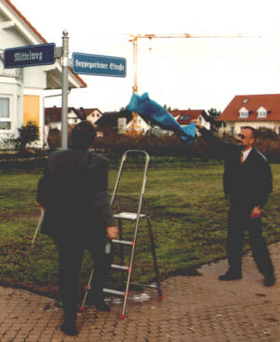 die Leiter, der unter Applaus den Müllsack vom neuen Straßenschild