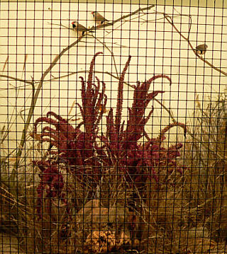 auf der Bühne ihre begehbare Großvolière aufgebaut,