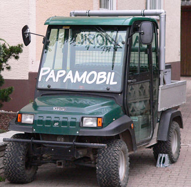 in großen Lettern „PAPAMOBIL“ auf der Windschutzscheibe.