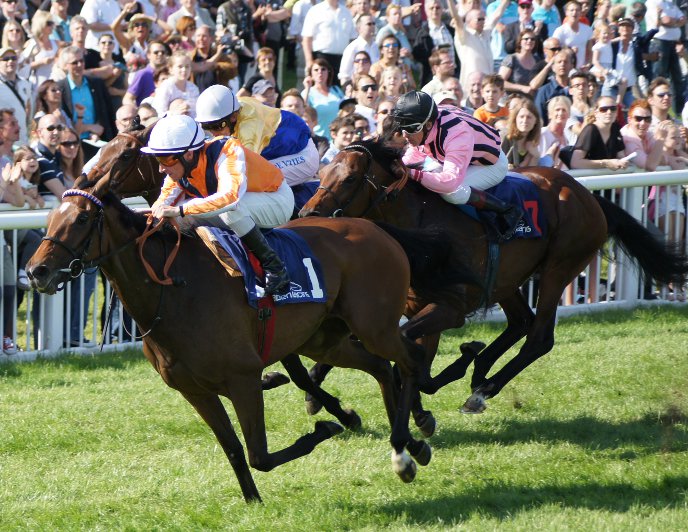 Einmal mehr wurde der Abschlußtag zum Triumph der unscheinabren Dame. Betrachtete man das Mägdelein auf dem Sattelplatz, drängte sich Danedream nicht unbedingt als Siegerin auf. Optisch waren da ganz andere Kaliber am Start. Wie zum Besipiel Ovambo Queen, die denn auch zum Schluß nochmal etwas Spannung ins Rennen brachte.