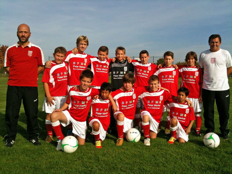 Die D-Jugend mit ihren Trainern Klaus Hildebrand und Guianni Tedesco bedanken sich für das Sponsoring eines nagelneuen Trikotsatzes einschl. Mannschaftskoffer bei der Fa. BFMS, Herrn Peter Merkel.