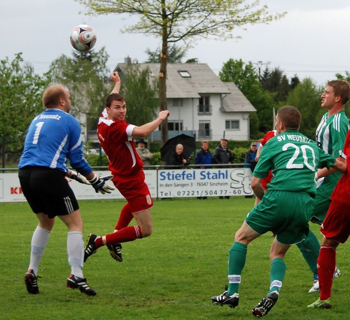 Ihrer letzten Chance auf den 2. Tabellenplatz bewusst kamen die Neusätzer aus der Kabine und stemmten sich gegen die drohende Niederlage. Unser Team wurde dementsprechend in die eigene Hälfte zurückgedrängt. Die Abwehr mit Darius Fiolka, Florian Seiwert, Kolja Zoller und Stefan Ernst hatte nun alle Füße voll zu tun und sorgte dabei dafür, dass bis auf wenige brenzlige Situationen nichts mehr anbrennen konnte. Vorne ackerte unser Spitze Axel Ludwigs bis zum Umfallen
