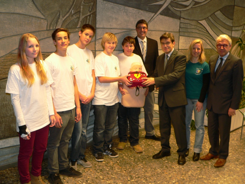 An Ort und Stelle demonstrierte der Schulsanitätsdienst an einer Übungspuppe den Schülern und Lehrern die lebensrettenden Sofortmaßnahmen mit einen AED, dessen Computerstimme exakte Anweisungen gab.