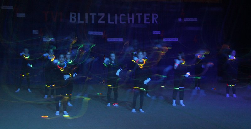 Mit in allen Neonfarben leuchtenden Schläuchen um Hals, Arm, Bein, Brille und Handgelenk, schlugen die von Gabriele Neher, Christina Merkel und Alina Schätz betreuten „Sweet Devils“ wie ein Blitz in die Halle ein, beeindruckende Farbreflexe auf der Nezthaut hinterlassend.
