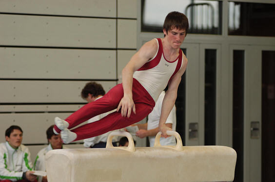 Wettkampfbeginn, als Cornelius Müller beim Einturnen am Reck schwer
