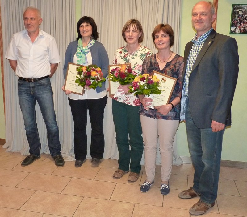 Mit einem Präsent gratulierte Rolf-Dieter Merkel der dritten Damenmannschaft (Martina Schief, Nora Pallek, Sigrid Vollmer und Kyra Peter) zu ihrer Meisterschaft in der Bezirksliga. Ebenso wurden Alice Kwasniok, Isabella Gärtner und Annette Hafermann geehrt für das Erringen des Damen-C-Bezirkspokals. Bettina Seiser wurde von Merkel für ihre Platzierungen auf Südbadischer und Baden-Württembergischer Ebene ausgezeichnet.