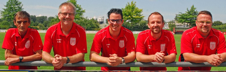 Das Trainer- und Betreuerteam: Patrick Duchet und Albin Schäfer Spielausschuß, Mario Westermann Co-Trainer, Axel König Trainer und Björn Hambach Spielausschuß. Nicht auf dem Bild aber als Trainer unserer 2. Mannschaft unersetzlich Thorsten Lorenz