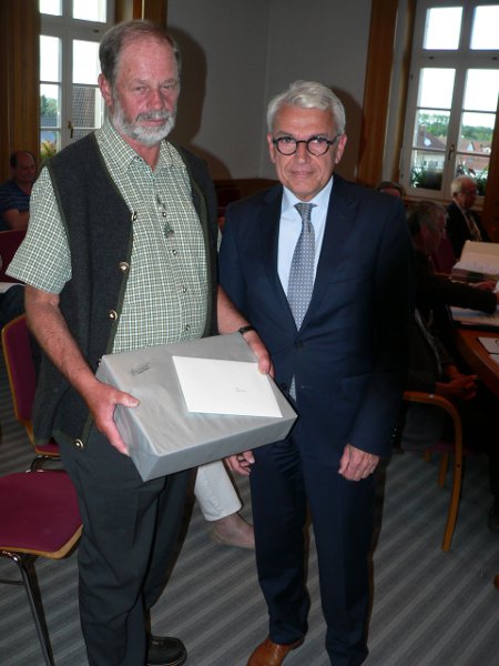 Nach 28 Jahren im Dienste der Gemeinde verabschiedete Bürgermeister Peter Werler den langjährigen Mitarbeiter Siegmund Röll in den verdienten Ruhestand. Der gelernte Elektroinstallateur habe im Bauhof den Fuhrpark betreut, sei zunächst stellvertretenter Klärwärter, danach 1. Klärwärter und dann stellvertretender Wassermeister gewesen. Röll hab sich in all den Jahren als engagierter und pflichtbewußter Mitarbeiter eingebracht. Peter Werler vergaß nicht zu erwähnen,