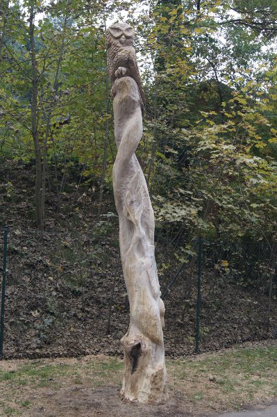Und da bekanntlich gut Ding Weile haben will, dauerte es bis Freitagnachmittag bis sich ein Gerüst um den Stamm rankte und die Künstler der Baden-Badener Firma Bretzinger mit Schälmesser und Säge ans Werk gingen. Sorgfältig wurden Rinde und Splintholz abgeschält und Blattornamente aus dem Kernholz hervorgehoben. Als Krönung wurde aus der Spitze eine Eule geformt.
