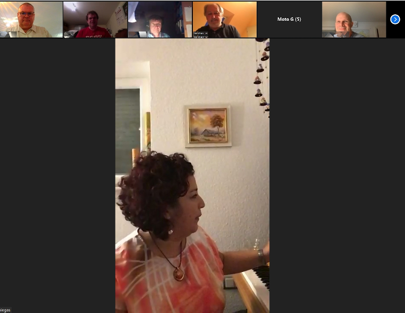 Die Männer trafen sich jedoch nicht im Probelokal im Kindergarten Sakt Martin, sondern in der virtuellen Welt der bits und Bytes. Videokonferenz hieß das Zauberwort. Registerweise klinkten sich die Herren Sänger in den Konferenzraum ein und peu à peu erschienen die Konterfeis der sangesfreudigen Herren am Bildschirmrand.