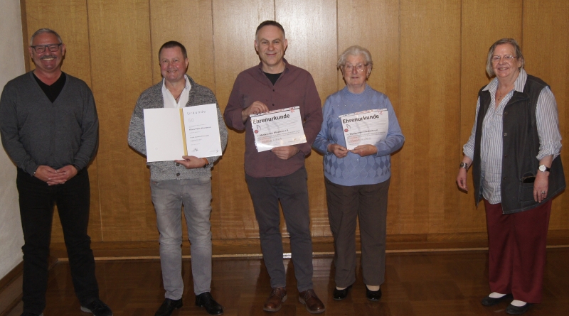 Bei den abschließenden Ehrungen wurde Klaus – Peter Kronimus vom Bund Deutscher Blasmusikverbände für 50 Jahre aktives Musizieren ausgezeichnet. Sei 40 Jahren ist Roland Moosmann aktiv. Nach 30 Jahren aktiven Musizierens wurde Matthias Ullrich zum Ehrenmitglied ernannt. Die gleiche Ehre wurde Hannelore Deris zuteil, welche seit 40 Jahren passives Mitglied ist.