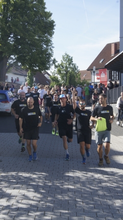 Kurz vor zehn ging es dann in leichtem Trab, begleitet von zahlreichen Unterstützern, die Lindenstraße hinab, über Josefstraße und „Schmierofen“ zum Parkplatz am Friedhof. Dort wurde es für die Läufer dann ernst. Das erste Team zu zwei Radfahrern und einem Läufer machte sich umjubelt auf den langen Weg ins Allgäu, gefolgt vom Tross der Begleitfahrzeuge.